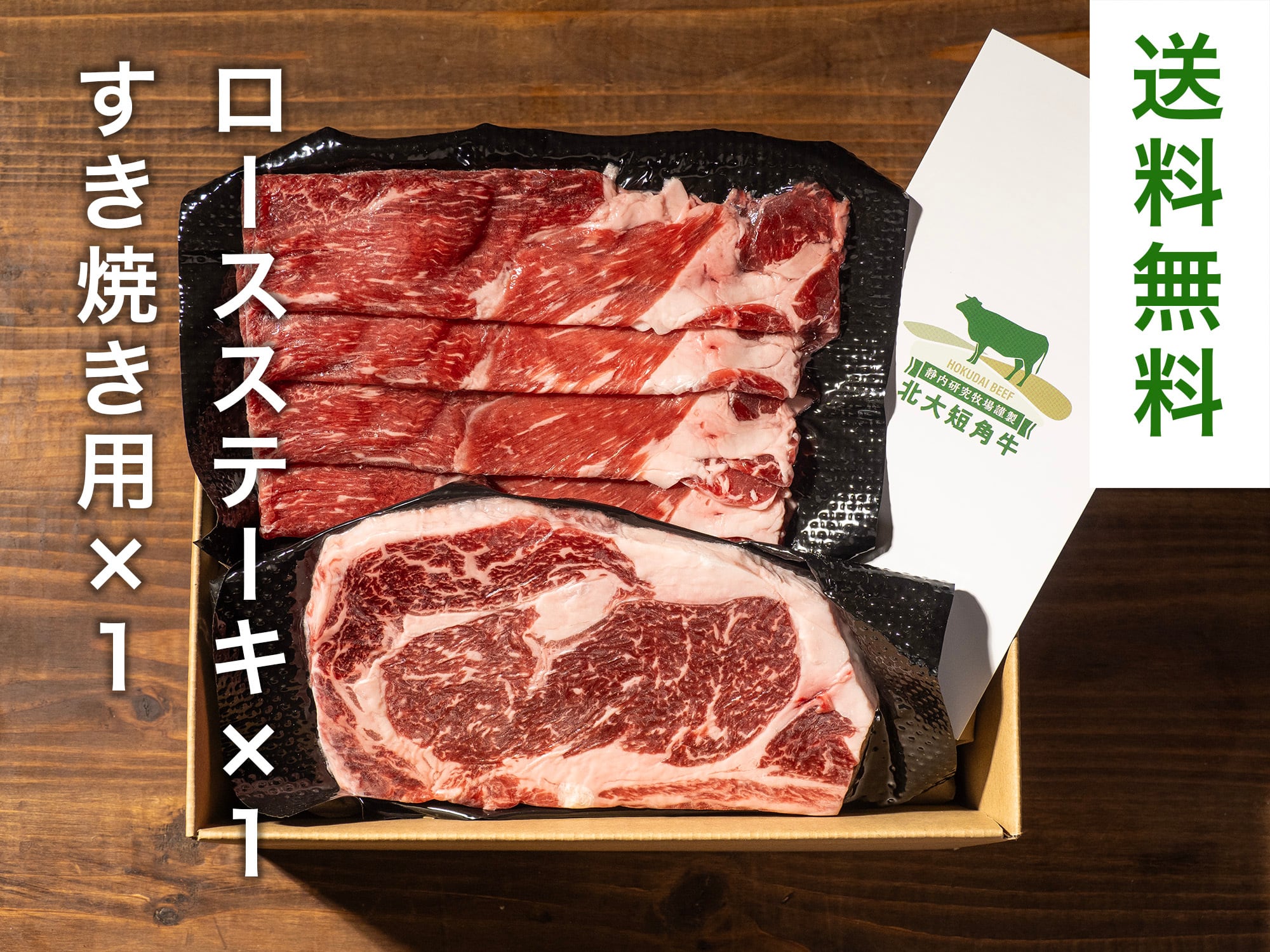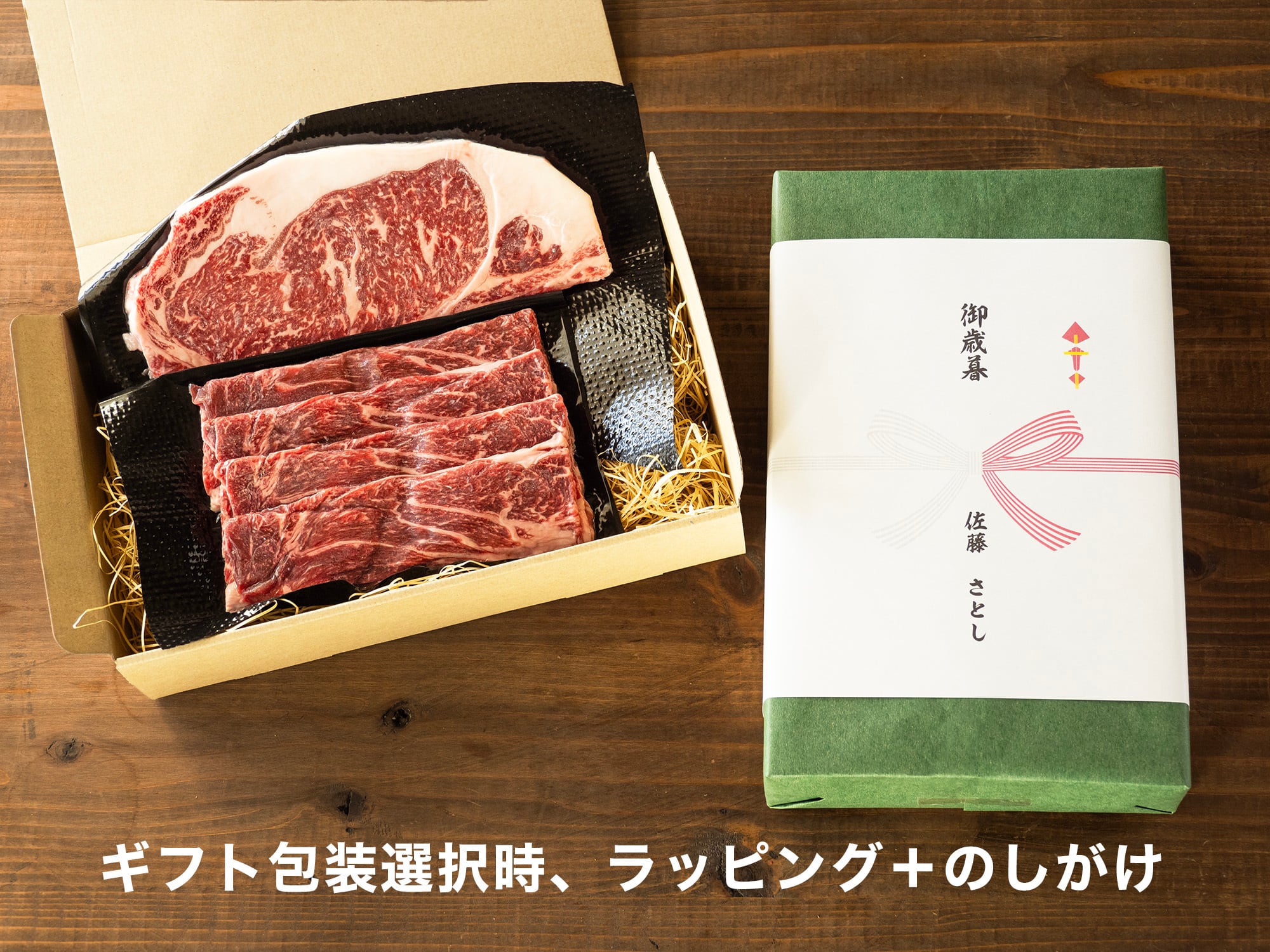 厚切りのジューシーなロースステーキと、やわらかなすき焼きをお楽しみいただける、年の瀬や年始など冬の贈り物にぴったりのセットをご用意しました。全国送料無料で、包装紙にのしを貼った特別ギフト包装(外箱入り)も、オプションでお選びいただけます。