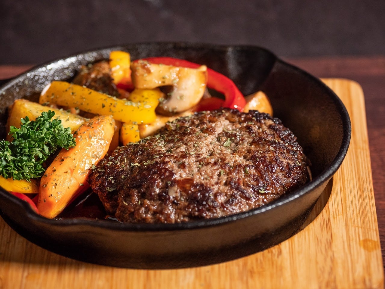 香ばしい玉ねぎと肉本来の風味による、シンプルですが深い味わいです。塩分は控えめですので、焼いた時に出た汁に、ケチャップとウスターソースでデミグラス風、または、にんにくと醤油、みりんを加えて和風ソースに大根おろしを添えるなど、お好みの味付けをお楽しみください。